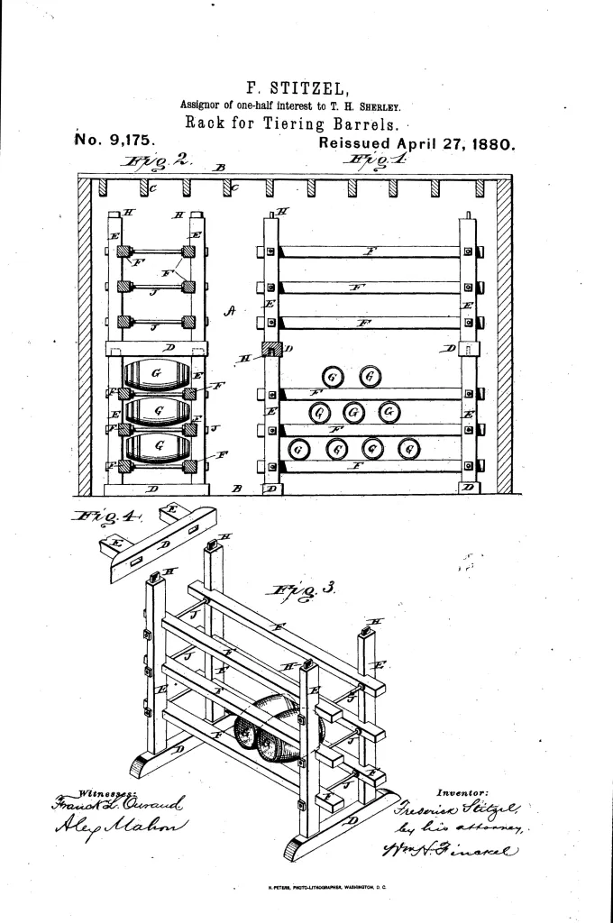 Negli anni ’70 del XIX secolo Frederick Stitzel sviluppò e brevettò un sistema di rastrelliere per botti nei magazzini, pensato per “migliorare l’invecchiamento”. La struttura permetteva una migliore circolazione dell’aria attorno alle botti, favorendo – secondo la teoria dell’epoca – una maturazione più rapida del contenuto. Prima di allora le botti venivano semplicemente impilate. Il sistema di Stitzel si diffuse rapidamente e divenne lo standard tuttora utilizzato nei magazzini di stagionatura.